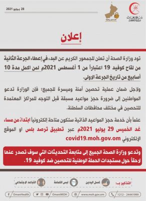 وأشارت وزارة الصحة إلى أن خدمة حجز المواعيد الذاتية ستكون مُتاحة إلكترونيًا ابتداءً من مساء يوم غد الخميس عبر الموقع الإلكتروني “http://covid19.moh.gov.om” وتطبيق ترصد “بلس”.