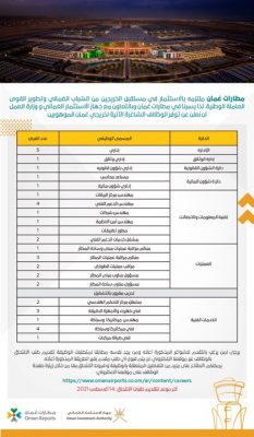 أعلنت “مطارات عمان” بالتعاون مع جهاز الاستثمار العماني ووزارة العمل عن توفر وظائف شاغرة للخريجين.