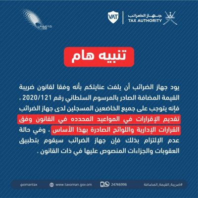 أصدر جهاز الضرائب تنبيهًا ، عبر حسابه الرسمي في تويتر ، قال فيه :” تنــبيه تقديم الإقرارات الضريبية. . نوجه عناية كافة المسجلين في ضريبة القيمة المضافة إلى الالتزام بتقديم الإقرارات الضريبية في موعدها المحدد تجنبـًا للعقوبات والجزاءات القانونية.”