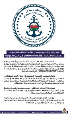 أفاد مصدر مسؤول بمركز الأمن البحري بأنه في إطار منظومة العمل البحري المشترك والتنسيق القائم بين مركز الأمن البحري بالسلطنة ومراكز الأمن البحري بمنطقة الإقليم، يواصل مركز الأمن البحري متابعته والتعامل مع ما تعرضت له الناقلة( ASPHALT PRINCESS) في المياه الدولية.