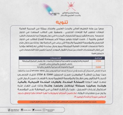 وهج الخليج- مسقط أصدرت وزارة التعليم العالي والبحث العلمي والابتكار ، عبر حسابها الرسمي في تويتر ، تنبيهًا ، فيما يلي نصه :