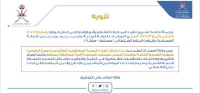 وهج الخليج- مسقط تعلن وزارة العمل عن بث رسائل نصية قصيرة للمواطنين المتقدمين ممن انطبقت عليهم الشروط العامة لوظيفة ( جندي مستجد) كمرحلة ثانية لمحافظة مسقط.
