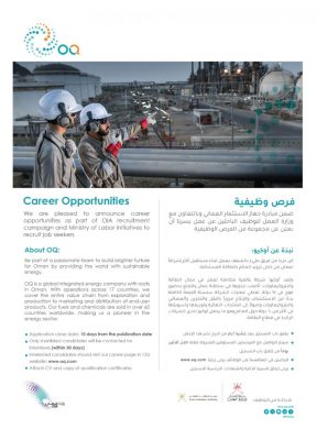 وهج الخليج- مسقط قالت شركة أوكيو أنه وضمن مبادرة جهاز الاستثمار العُماني وبالتعاون مع وزارة العمل لتوظيف الباحثين عن عمل، فقد أعلنت الشركة عن عدد من الفرص الوظيفية.