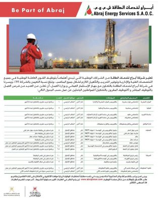 أعلنت شركة أبراج لخدمات الطاقة بالتعاون مع جهاز الاستثمار العماني ووزارة العمل، عن فرص عمل بالتوظيف المباشر والتوظيف المقرون بالتشغيل للمواطنين الباحثين عن عمل.