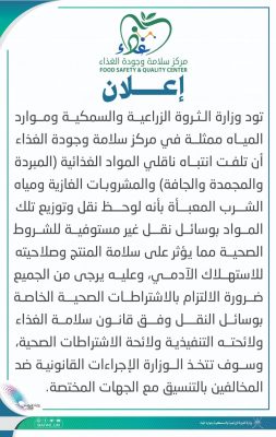 أصدرت وزارة الثروة الزراعية والسمكية وموارد المياه ، تنبيهًا لناقلي المواد الغذائيـة (المبـردة والمجمدة والجافـة) والمشروبـات الغازيـة ومياه الشرب المعبأة، في ما يلي نصه: