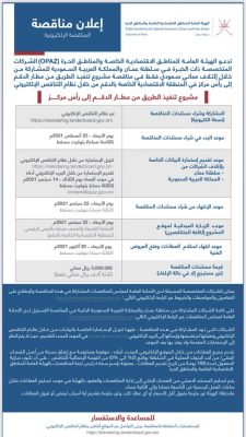 دعت الهيئة العامة للمناطق الاقتصادية الخاصة والمناطق الحرة الشركات المتخصصة ذات الخبرة في سلطنة عمان والمملكة العربية السعودية للمشاركة من خلال إئتلاف عماني سعودي فقط في مناقصة مشروع تنفيذ الطريق من مطار الدقم إلى رأس مركز في الهيئة العامة للمناطق الاقتصادية الخاصة والمناطق الحرة ، من خلال نظام التناقص الإلكتروني عبر الرابط: