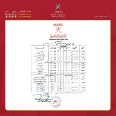 أعلنت وزارة التربية والتعليم في حسابها الرسمي عبر موقع “تويتر” عن جدول امتحانات دبلوم التعليم العام (الدور الثاني) للعام الدراسي 2021/2020م.