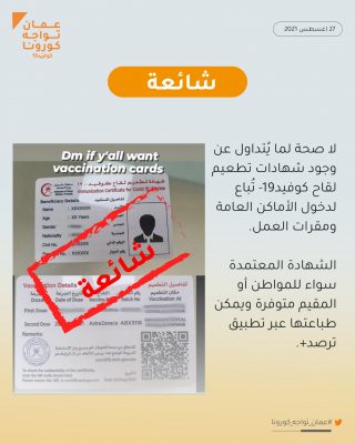 نفى حساب عمان تواجه كورونا شائعة وجود شهادات تطعيم لقاح فيروس كورونا مزورة وقال “لا صحة لما يُتداول عن وجود شهادات تطعيم لقاح كوفيد-١٩ تُباع لدخول الأماكن العامة ومقرات العمل”.