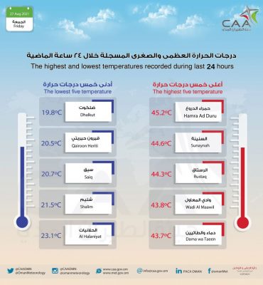 سجلت حمراء الدروع أعلى درجة حرارة في السلطنة يوم أمس الخميس بتسجيلها 45.2 درجة مئوية، تلتها السنينة 44.6 درجة مئوية.