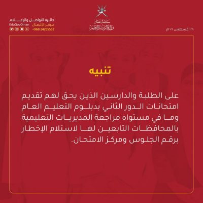 أصدرت وزارة التربية والتعليم تنبيها خاصا للطلبة والدارسين بدبلوم التعليم العام حول امتحانات الدور الثاني، فيما يلي نصه: