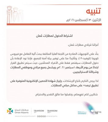 وهج الخليج- مسقط أصدرت مطارات عمان تنبيها باقتصار الدخول لمباني المطارات على الأفراد المحصنين اعتباراً من يوم الأربعاء ١ سبتمبر ٢٠٢١م.