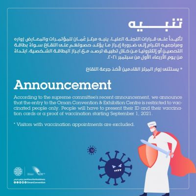 وهج الخليج- مسقط أصدر مركز عُمان للمؤتمرات والمعارض تنبيها لجميع زوار ومُراجعي مركز عُمان للمؤتمرات والمعارض على ضرورة إبراز إثبات تلقي اللقاح امتثالاً لقرارات .