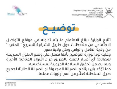 أصدرت وزارة النقل والاتصالات وتقنية المعلومات توضيحًا بشأن ما تم تداوله في مواقع التواصل الاجتماعي حول طريق الشرقية السريع “المفرد” بدءًا من ولاية الكامل والوافي وحتى ولاية صور، وجاء فيه: