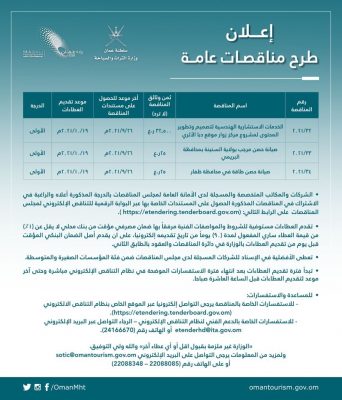 وهج الخليج- مسقط أعلنت وزارة التراث والسياحة عن طرح مناقصات عامة ، في ما يلي بيانها: