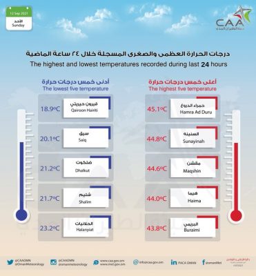 كشفت الأرصاد الجوية العمانية في حسابها الرسمي عبر موقع “تويتر” عن درجات الحرارة العظمى والصغرى المسجلة خلال 24 ساعة الماضية.