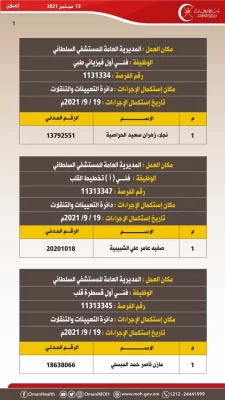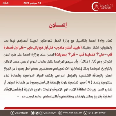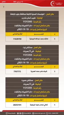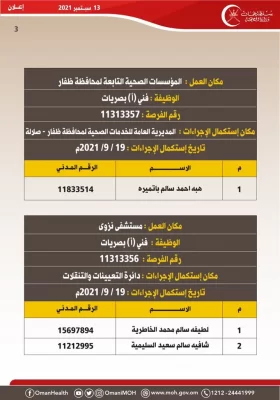 أعلنت وزارة الصحة بالتنسيق مع وزارة العمل أن المواطنين المبينة أسماؤهم فيما بعد والمقبولين للعمل بوزارة الصحة على ضوء إعلان الشواغر رقم (3/ 2021)، بأن عليهم المراجعة خلال ساعات الدوام الرسمي حسب الأماكن والتواريخ الموضحة وذلك لإنهاء إجراءات تعيينهم.