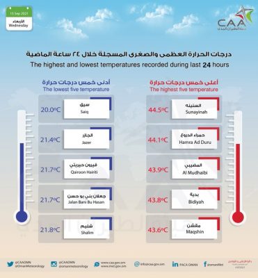 وأوضحت الأرصاد أن أعلى درجة حرارة سجلت في السنينة وبلغت 44.5 درجة سيليزية ، فيما سجلت سيق أدنى درجة حرارة وبلغت 20 درجة سيليزية.