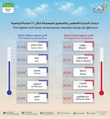 سجلت ولاية مقشنن أعلى درجة حرارة يوم أمس الخميس بتسجيلها 43.3 درجة، تلتها وادي المعاول بـ 34.1 درجة.