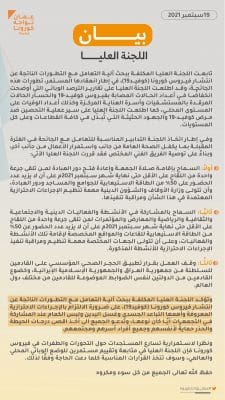 اللجنة العليا تصدر عددا من القرارات من بينها السماح بإقامة صلاة الجمعة وإعادة فتح دور العبادة و السماح بالمشاركة في الأنشطة والفعاليات الدينية والاجتماعية والثقافية والرياضية والمعارض والمؤتمرات لمن تلقى جرعة واحدة من اللقاح على الأقل حتى نهاية شهر سبتمبر ٢٠٢١.