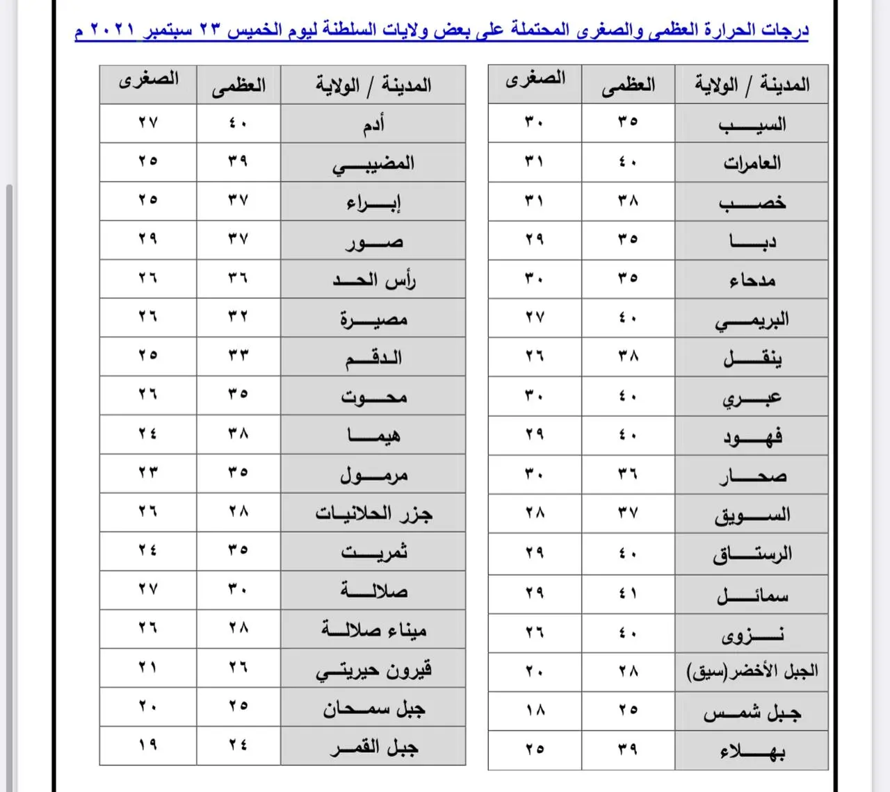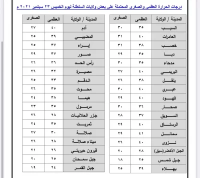 وإليكم درجات الحرارة في مختلف ولايات السلطنة: