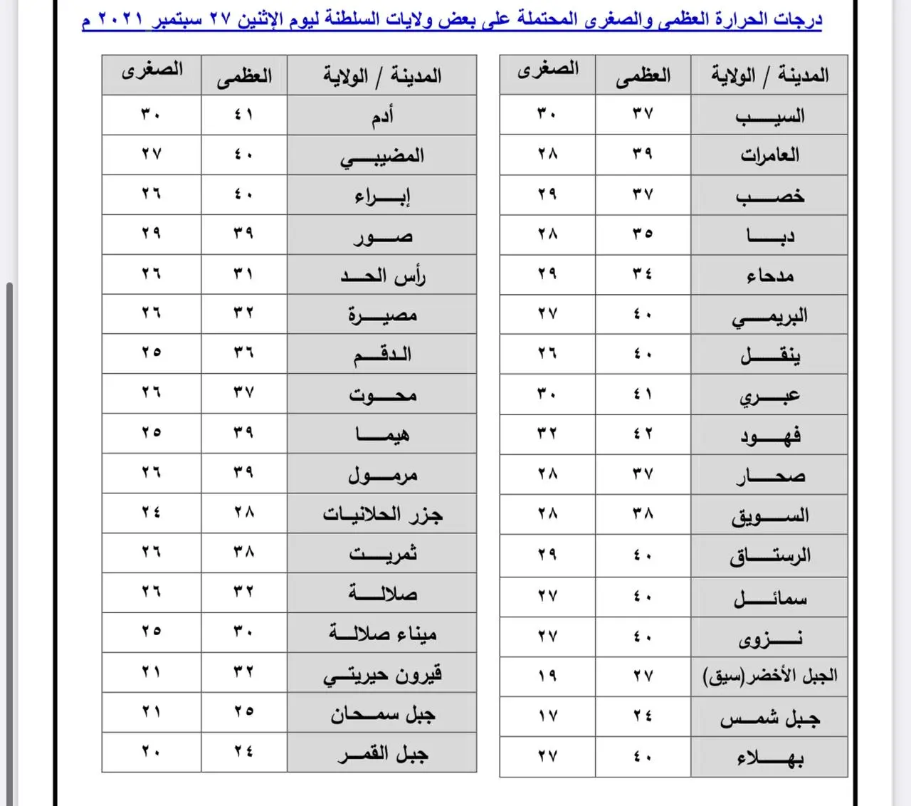 سيكون طقس اليوم الاثنين صحوًا إلى غائم جزئيًا على الشريط الساحلي لمحافظة ظفار والجبال المجاورة، وصحوًا بوجه عام على بقية محافظات السلطنة مع تدفق السحب العالية والمتوسطة ، واحتمال تكون السحب الركامية وهطول أمطار رعدية متفرقة على جبال الحجر والمناطق المجاورة خلال فترة ما بعد الظهيرة والمساء، وفرص لتطاير الغبار والأتربة بفعل حركة الرياح النشطة على المناطق الصحراوية والمكشوفة، واحتمال تشكل السحب المنخفضة أو الضباب آخر الليل والصباح الباكر على أجزاء من سواحل بحر العرب وبحر عمان.