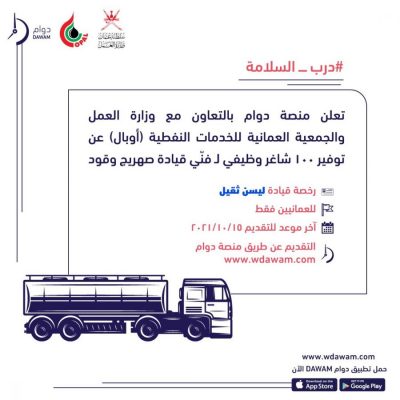 أعلنت منصة دوام بالتعاون مع وزارة العمل والجمعية العمانية للخدمات النفطية (أوبال) عن توفير ١٠٠ شاغر وظيفي لفنّي قيادة صهريج وقود.