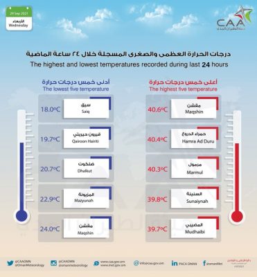 كشفت الأرصاد الجوية العمانية في حسابها الرسمي عبر موقع “تويتر” عن درجات الحرارة العظمى والصغرى المسجلة خلال 24 ساعة الماضية.