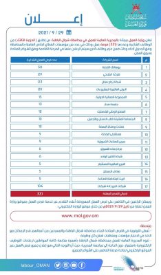 تعلن وزارة العمل ممثلة بالمديرية العامة للعمل بمحافظة شمال الباطنة عن إطلاق الحزمة الثالثة من الوظائف الشاغرة بعدد من مؤسسات القطاع الخاص العاملة بالمحافظة لمختلف التخصصات والمؤهلات عبر خدمة فرص العمل بموقع الوزارة الإلكتروني : https://www.mol.gov.om/