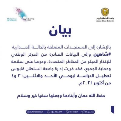 وهج الخليج_ مسقط قررت جامعة السلطان قابوس تعطيل الدراسة يومي الأحد والاثنين.