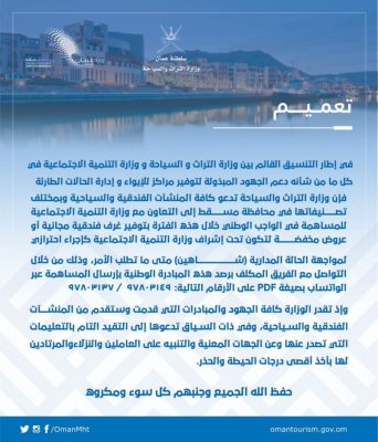 دعت وزارة التراث والسياحة جميع المنشآت الفندقية والسياحية للتعاون مع وزارة التنمية الاجتماعية وذلك بالمساهمة في توفير غرف مجانية أو بأسعار منخفضة تكون تحت اشراف وزارة التنمية الاجتماعية كإجراء احترازي