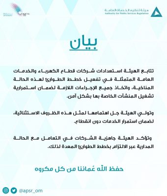 وهج الخليج- مسقط أصدرت هيئة تنظيم الخدمات العامة بيانًا حول استعداداتها للتعامل مع مستجدات الحالة المدارية شاهين