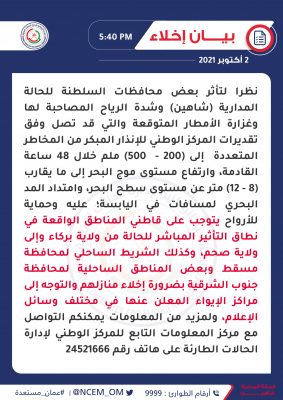 على قاطني المناطق الواقعة في نطاق التأثير المباشر للحالة من ولاية بركاء وإلى ولاية صحم، وكذلك الشريط الساحلي لمحافظة مسقط وبعض المناطق الساحلية لمحافظة جنوب الشرقية إخلاء منازلهم والتوجه إلى مراكز الإيواء المعلن عنها في مختلف وسائل الإعلام.