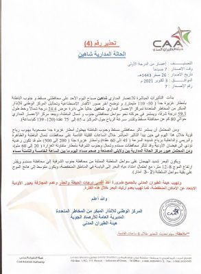 وهج الخليج-مسقط هيئة الطيران المدني تصدر تحذير رقم 4 حول الإعصار المداري (شاهين) في بحر العرب.