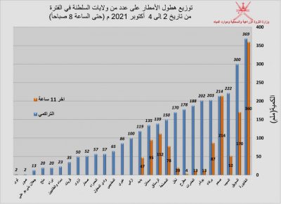 وهج الخليج_ مسقط توزيع هطول الأمطار على عدد من ولايات السلطنة خلال الفترة من 2 إلى 4 أكتوبر 2021م. ( حتى الساعة 8 صباحاً ):