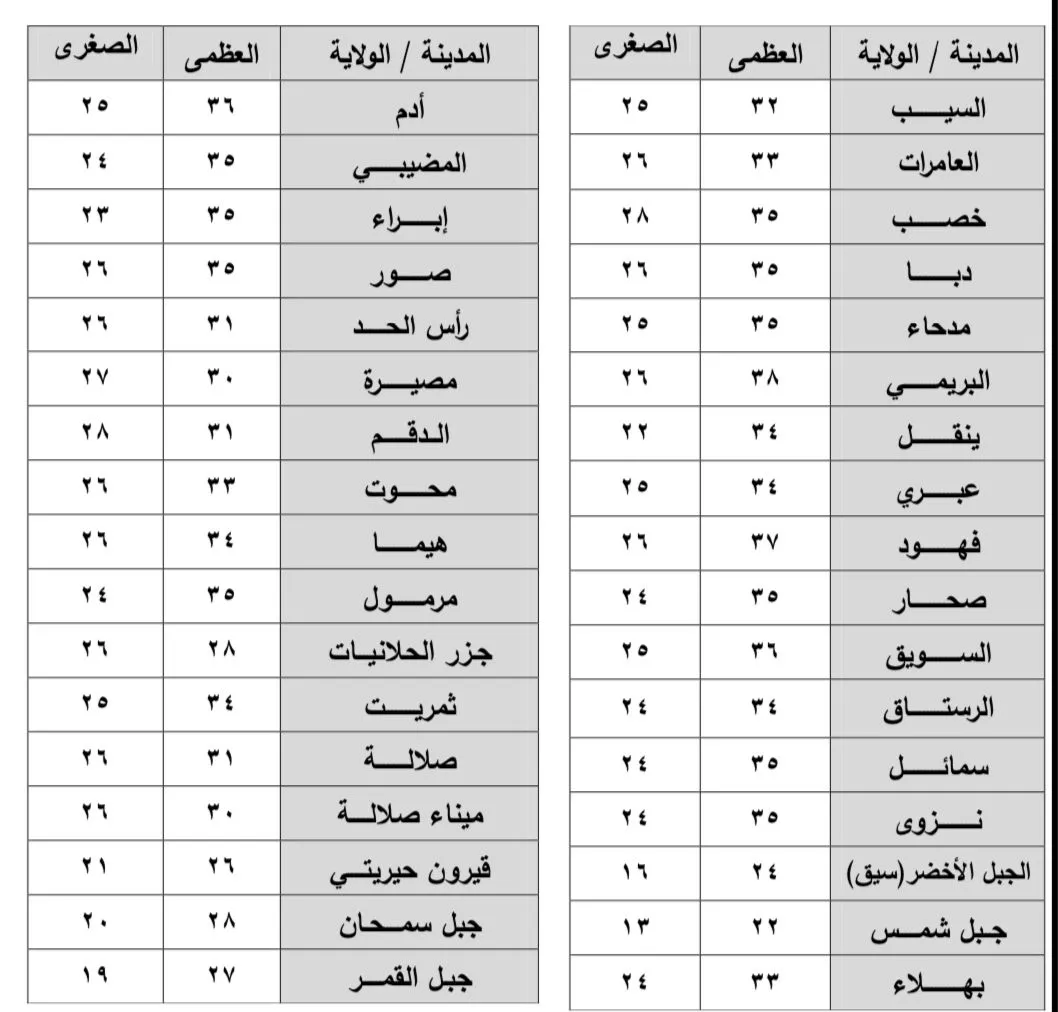 إليكم درجات الحرارة المتوقعة في بعض ولايات السلطنة: