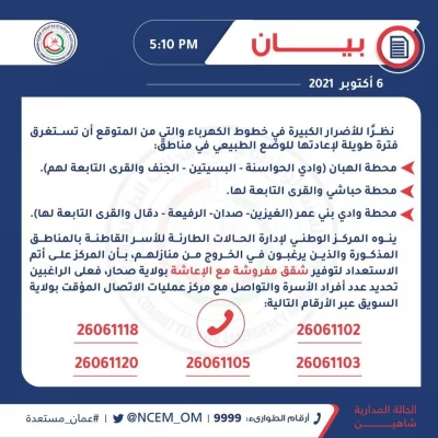 المركز الوطني لإدارة الحالات الطارئة يبدي استعداده لتوفير شقق فندقية مع الإعاشة للأسر القاطنة في المناطق التي تعذر إعادة خدمة الكهرباء بها.