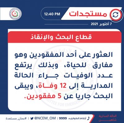 العثور على أحد المفقودين جراء الحالة المدارية شاهين وهو مفارق للحياة، إنا لله وإنا إليه راجعون.