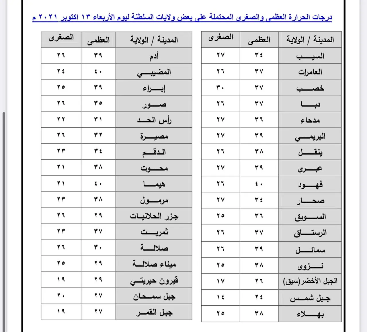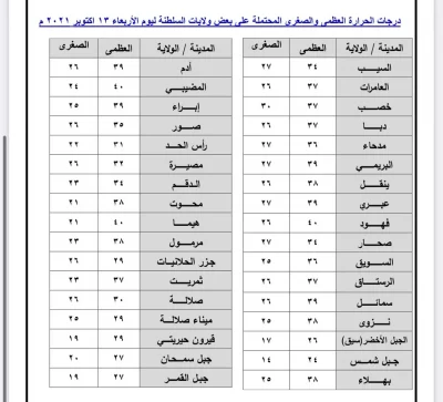 إليكم درجات الحرارة في بعض مناطق السلطنة: