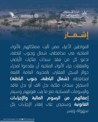 تأكيدًا على الدور المجتمعي لدعم المتضررين من تأثيرات الحالة الجوية شاهين. ستعمل وزارة الإسكان والتخطيط العمراني على تقديم التسهيلات الإجرائية لاستخراج بدل فاقد للوثائق المفقودة وبدون رسوم ، التفاصيل أدناه: