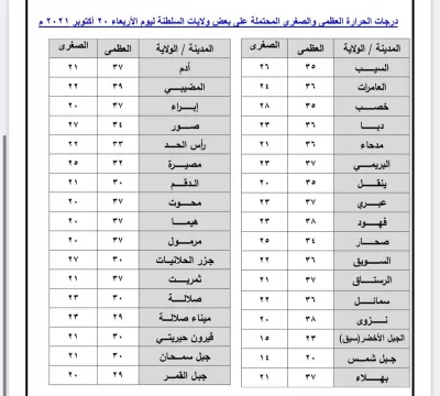 أما درجات الحرارة في بعض مناطق السلطنة فهي كالآتي: