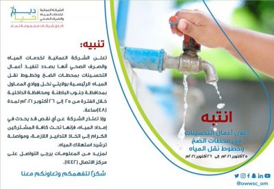 قال حساب الشركة العمانية لخدمات المياه والصرف الصحي-إحدى شركات مجموعة نماء عبر موقع “تويتر” أن هناك أعمال تحسينات في خطوط المياه بولايات الداخلية ووادي المعاول ونخل وتوقع بتأثر الخدمة لمدة يومين.