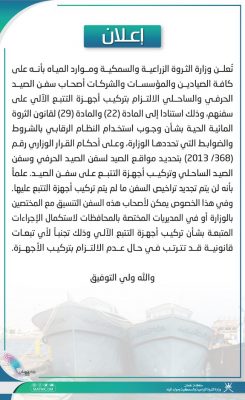 أعلنت وزارة الثروة الزراعية والسمكية وموارد المياه بأنه على الصيادين والمؤسسات والشركات أصحاب سفن الصيد الحرفي والساحلي الالتزام بتركيب أجهزة التتبع الآلي على سفنهم.