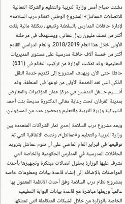 في ٣١ ديسمبر ٢٠١٨م ، طالعتنا وسائل الإعلام بخبر مطمئن لأولياء الأمور في السلطنة كان مفاده “دشّنت صباح أمس وزارة التربية والتعليم والشركة العمانية للاتصالات «عمانتل» المشروع الوطني «نظام درب السلامة» لإدارة حافلات المدارس بالسلطنة وتتبعها، بتكلفة مالية بلغت أكثر من نصف مليون ريال عماني، ويستهدف في مرحلته الأولى خلال هذا العام 2019/2018، والعام الدراسي القادم أكثر من خمسة آلاف حافلة مدرسية على مستوى المديريات التعليمية؛ وقد تمكنت الوزارة من تركيب النظام في (631) حافلة حتى الآن، ويهدف المشروع إلى تقديم خدمة النقل الذكي التي تعد الخدمة الأولى من نوعها في المنطقة. وقد أقـــــيم حـــفل التدشين في مركز عمان للمؤتمرات والمعارض بمدينة العرفان”