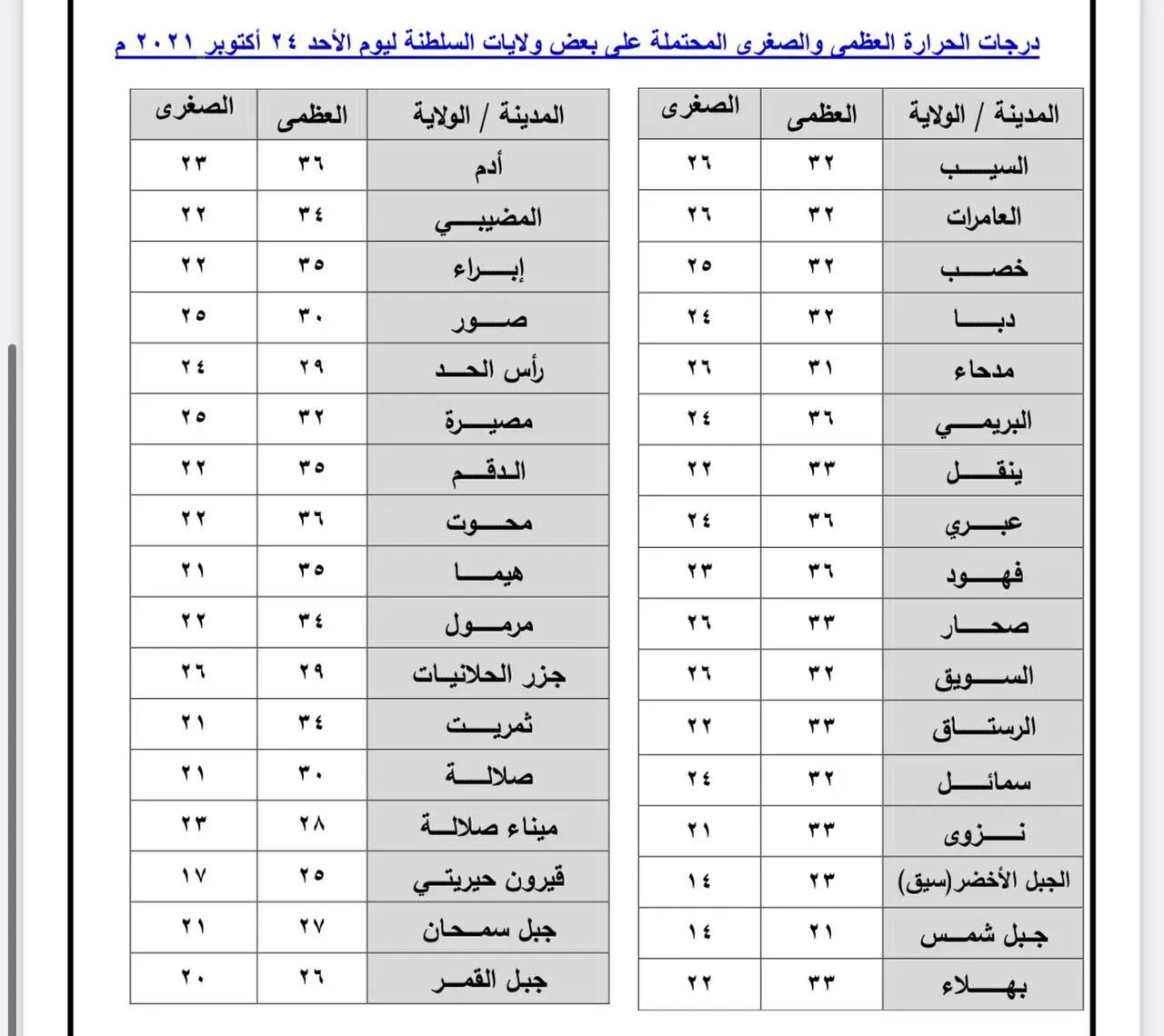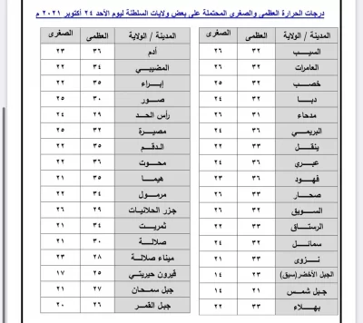 إليكم درجات الحرارة في بعض مناطق السلطنة: