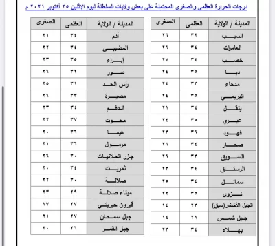 إليكم درجات الحرارة في بعض مناطق السلطنة: