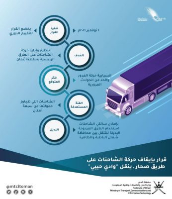 في إطار تنظيم وإدارة حركة الشاحنات على الطرق الرئيسية بالسلطنة وسعيًا إلى إنسيابية حركة المرور والحد من الحوادث المرورية، أصدرت وزارة النقل والاتصالات وتقنية المعلومات بالتعاون مع شرطة عمان السلطانية قرارا بإيقاف حركة الشاحنات على طريق صحار ـ ينقل التي تتجاوز حمولتها عن سبعة أطنان، وذلك اعتبارًا من الأول من نوفمبر القادم مع التقييم الدوري للقرار، حيث بإمكان سائقي الشاحنات استخدام الطرق المزدوجة البديلة للتنقل بين محافظة شمال الباطنة والظاهرة، وتهيب الوزارة الجميع التقيد بالقرار خدمة للصالح العام.
