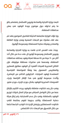 أصدرت وزارة التجارة والصناعة وترويج الاستثمار بيانًا حول ما يتم تداوله في موضوع جودة الوقود في بعض محافظات السلطنة.