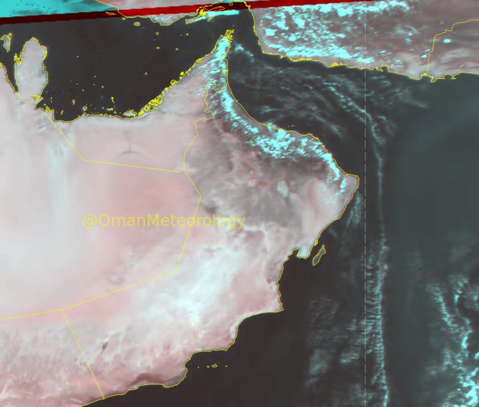 نشر حساب الأرصاد الجوية العمانية صورة جوية توضح استمرار تشكل السحب على محافظة مسندم و جبال الحجر و المناطق الساحلية المطلة على بحر عمان مع هطول أمطار متفرقة رعدية أحيانا.