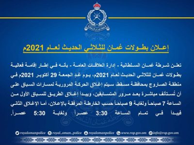 وهج الخليج_ مسقط أعلنت شرطة عمان السلطانية عن إغلاق مسارات موقع بطولات عمان للثلاثي الحديث لعام 2021م في الفترتين الصباحية والمسائية من يوم غدٍ الجمعة :
