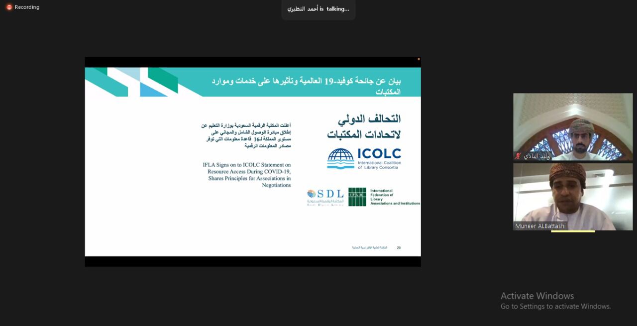 وقال: أنقل لكم مباركة وتهنئة وزارة الثقافة والرياضة والشباب، والمشاركين في الملتقى لجميع المكتبات الفائزة في مسابقة الإجادة للمكتبات والمراكز الثقافية الأهلية، والتي خصصت هذا العام لقياس أدائها في التعامل مع التحديات الطارئة في ظل جائحة (كوفيد 19)، متمنين لهم ولجميع المشاركين مزيدا من العطاء في المستقبل إن شاء الله.